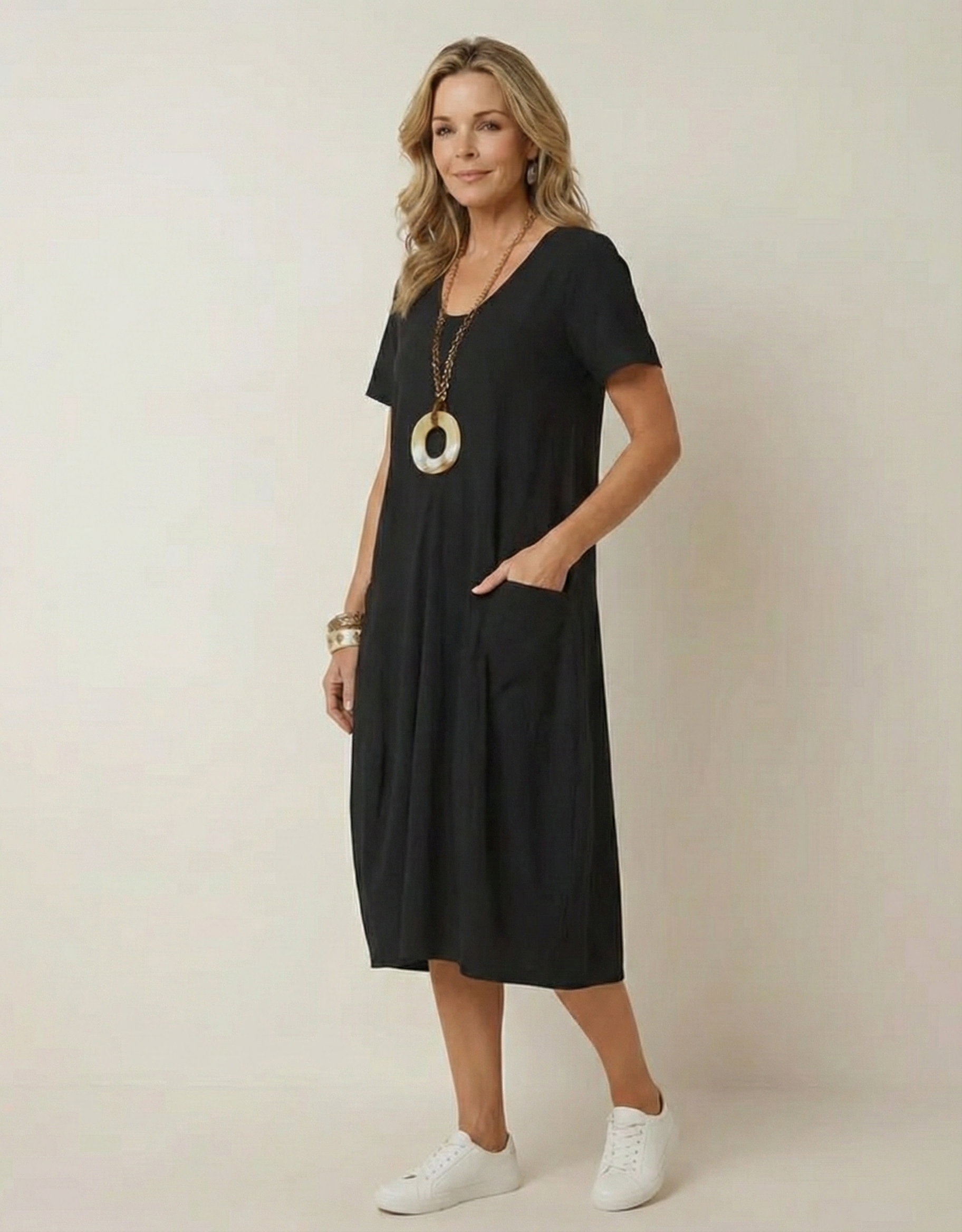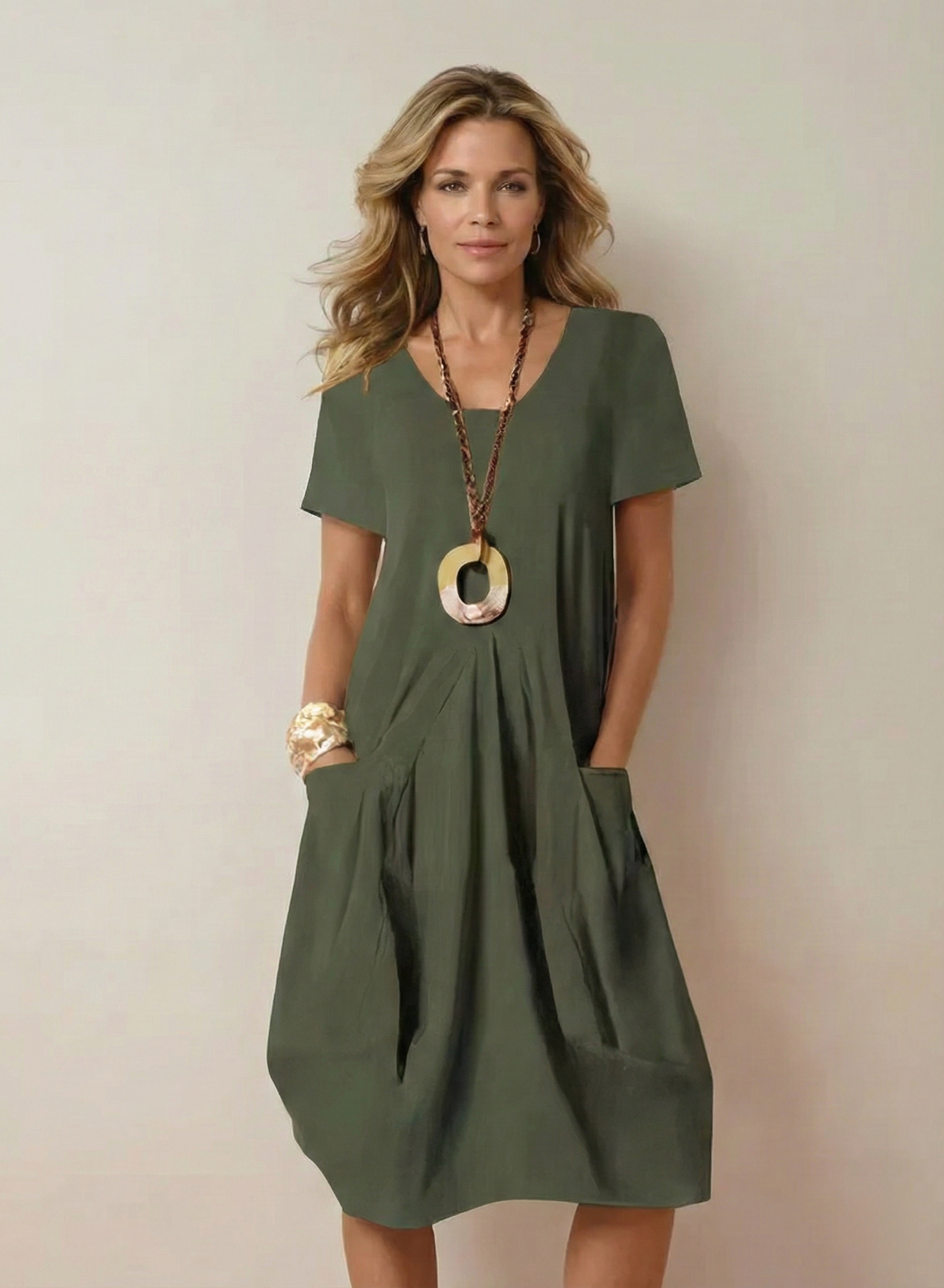 With a round neckline, classic sleeves, and practical pockets, this dress is crafted from high-quality cotton. The A-line design flatters every figure and allows for optimal freedom of movement, making it perfect for any occasion.